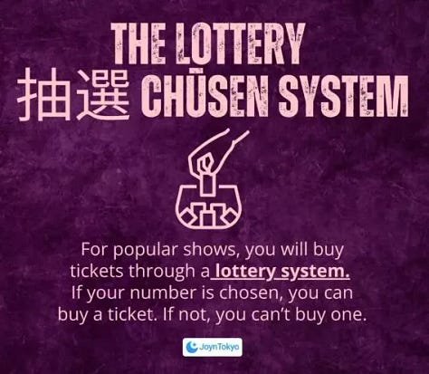 A japán koncertkultúra sajátos intézménye az úgynevezett „chūsen”, vagyis a jegylottó rendszere. A legnépszerűbb koncertek esetében a rajongók nem közvetlenül vásárolnak jegyet, hanem előzetesen jelentkezhetnek a vásárlás lehetőségére. Ha végül kisorsolják őket, a rendszer automatikusan levonja a jegy árát a megadott bankkártyáról. A folyamat célja a jegyüzérkedés visszaszorítása és az esélyek egyenlőbb elosztása. A módszer jól működik, de a vásárló sokszor csak utólag tudja meg, pontosan hova is szól a jegye.