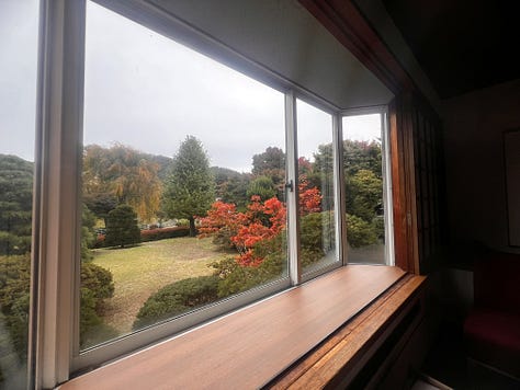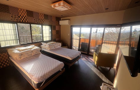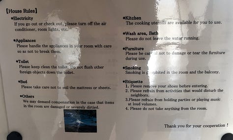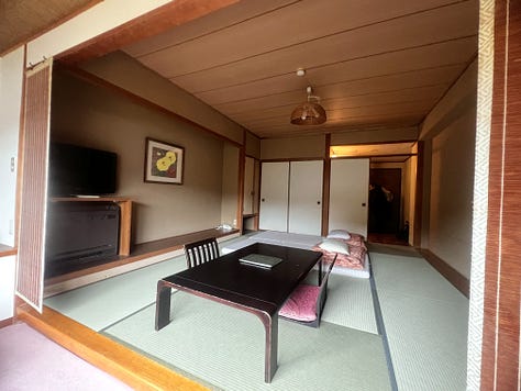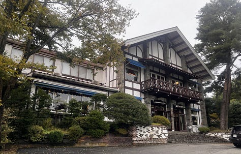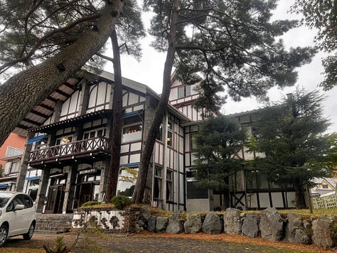 A koraesti csúcsforgalom csak este nyolc körül csillapodott, de akkor már jócskán messze jártunk a várostól. Végül este kilenc előtt – még mindig zuhogó esőben – érkeztünk meg a Twin Peaks sorozat hangulatát idéző, svájci fachwerk stílusban épült ryokan szállásunkhoz. A recepciós ojisan először mogorván egyeztette adatainkat, majd, amikor szegényes japán szókincsemmel néhány dicsérő megjegyzést tettem a szállodájára, hirtelen megenyhült. Ahogy előkerültek japán igazolványaink, kifejezetten barátságos és nyájas lett. Mosolyogva vitt a szobánkhoz, és hosszasan magyarázta a szokásos japán házirendet: “a cipőt le kell venni a genkánnál, a tatamira csak zokniban léphetünk, …” de hamar leintettem; もちろん、もちろん いいですよ vagyis „mochiron-mochiron ii desu yo” (persze-persze, tudjuk, jól van).