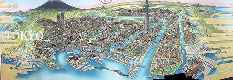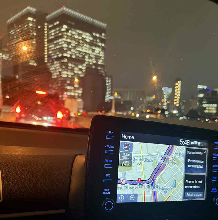 Ha megnézed a térképet, kedves követő-rajongó, akkor láthatod, hogy a mi kis városunk, Tōgane és Fujikawaguchiko között a legrövidebb út azt jelenti, hogy diagonálisan át kell vezetni a 38 milliós Tokión – mindezt tájfun idején, zuhogó esőben, a péntek délutáni csúcsforgalomban, miközben az autó navigációja néha japánul adja az instrukciókat, annak ellenére, hogy angolra állítottam. Japánt jól ismerő nyájas olvasóimat most külön megkérem, ne adjanak ötleteket, hogy át lehet jutni a Tokiói-öböl alatt lévő Aqualine alagúton. Igen, tudom. Arra hosszabb, és péntek délután Tokióban mindenhol dugó van. Ott is. Sőt.