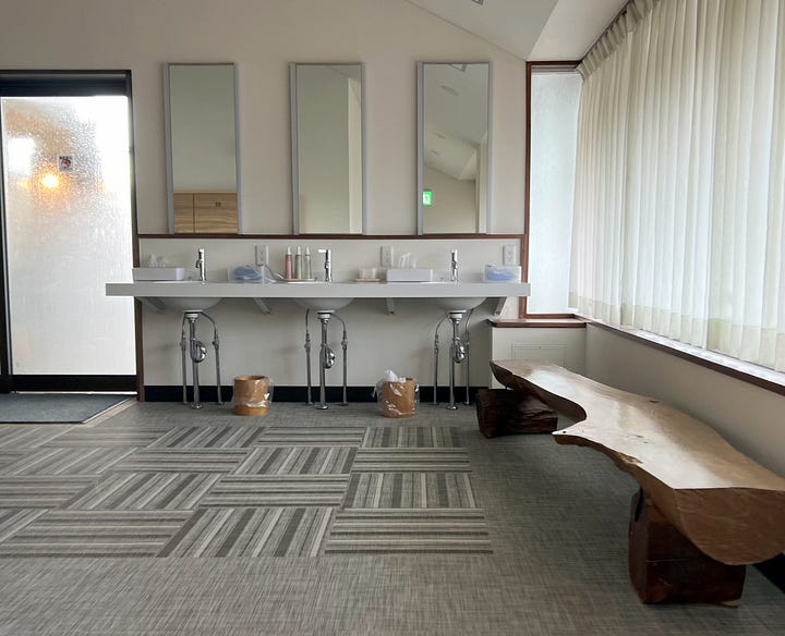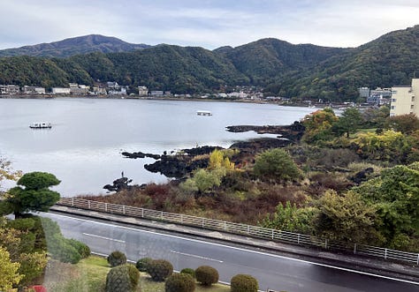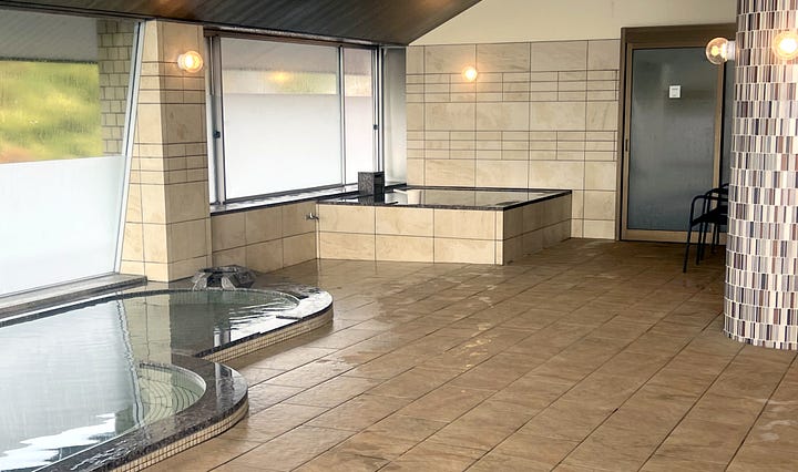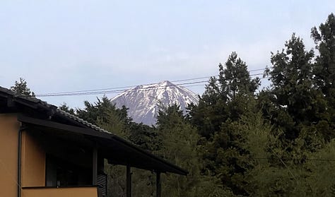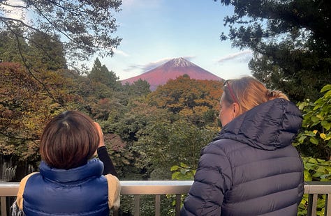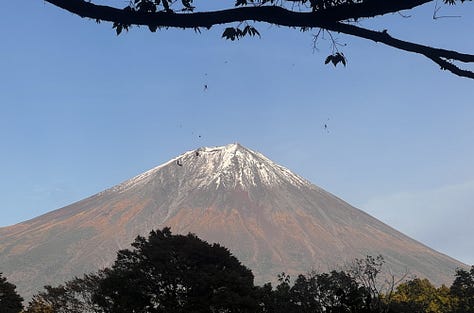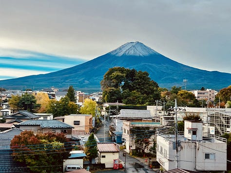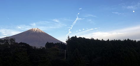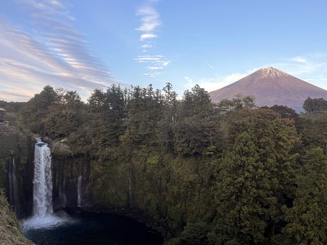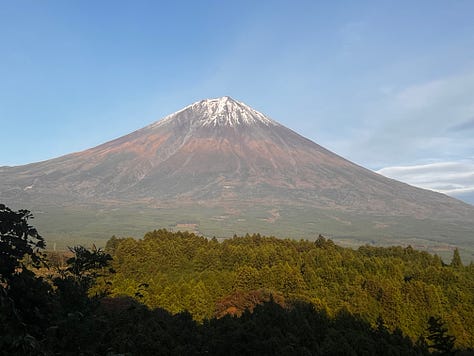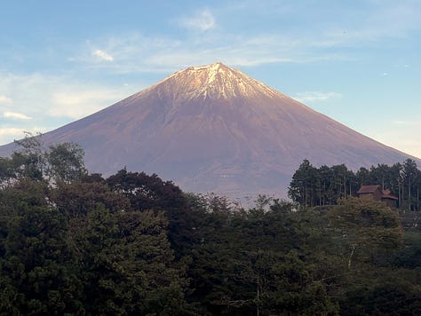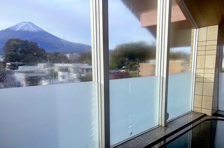 Másnap reggelre a tájfun tovább vonult, és a tetőn kialakított forró vizű onsenből bámulhattuk a káprázatos Fujisant, ami szinte kéznyújtásnyira volt. Valójában nagyjából 8-10 kilométerre. Az onsenekben egyébként szigorúan tilos fényképezni, de reggel hétkor még üres volt.