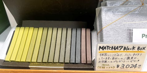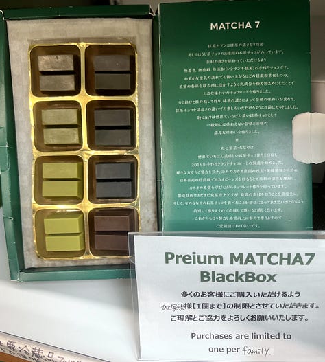 Az egyik alkalmazottat arról faggattam, miért tartják ezeket annyira különlegesnek, hiszen elvileg bárki készíthet magának otthon kézműves teát, én például naponta többször is, és az még soha nem került félliterenként 3 500 - 5 000 jenbe. Talán van némi alkoholtartalma is, azért palackozzák be ilyen szépen? Az eladón látszott, hogy nem először hall ilyen felháborítóan ostoba kérdést. Kedvesen, de határozottan csak annyit mondott: amit én otthon főzök, az biztosan nem lesz ennyire elképesztően finom. Nem sikerült meggyőznie. A drága palackozott teáknak sikeresen ellenálltunk, de a matchát és a szálas zöld teákat azért nem hagytuk ott.