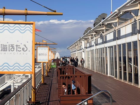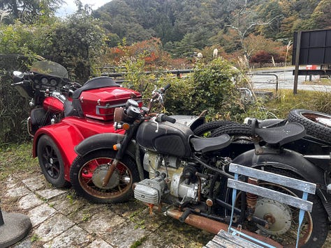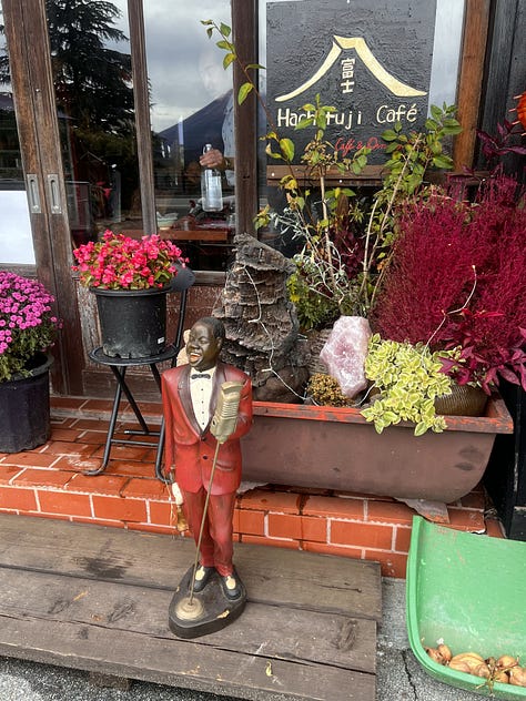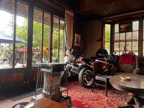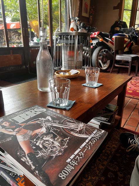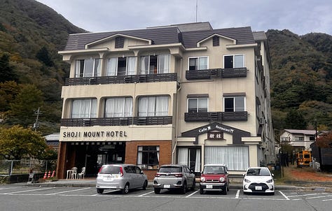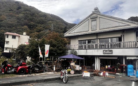 Továbbindulva napközben megálltunk a sokkal szerényebb Shōji-tónál, amely ellentétben híresebb testvérével már korántsem vonzza annyira a turistákat, mint Fujikawaguchiko. Itt nem a tó különleges szépsége miatt álltunk meg, valami egészen mást kerestünk: a Netflixen nyáron találkoztunk a „Hot Spot”, japánul „Hotto Supotto” című japán vígjátékkal. A főhős egy ötvenes éveiben járó földönkívüli, akinek ugyan teljesen emberi formája van, de szuperképességekkel rendelkezik, és ebben a Shōji-tó partján lévő kis szállodában dolgozik. A hotel bejáratánál természetesen már kiraktak egy fénymásolt tiltó táblát, hiszen az elmúlt hónapokban valószínűleg sokan szerettek volna a recepciós pultnál pózolni. Mi azonban nem itt időztünk, hanem a mellette lévő sokkal izgalmasabb motoros kocsmába tértünk be.