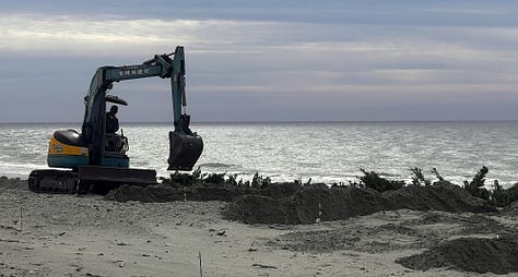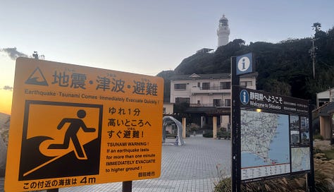 Reggel még sétáltunk egyet az óceánparti homokdűnéken. A távolban látható a hamaokai atomerőmű, amelyet a közelmúltban zártak be. Az általa termelt áramot most a közeli szélturbinákkal próbálják kiváltani. / Az első két képen látható fák az állandó erős szél miatt nőttek bedőlve. / A 8. képen a dűnéken épp homokfogó sövényt telepítenek. / A 9. képen a mindenhol elérhető cunami evakuációs tervet osztottuk meg. (a Tunami helyesírására ügyelni kell)
