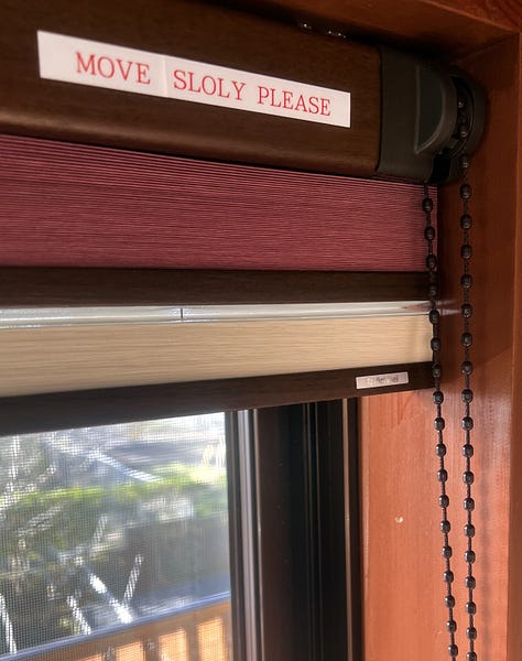 Szállásadónk építészmérnök, és ennek megfelelően az egész házat különböző hasznosnak vélt instrukcióval ragasztotta körbe. Még a redőnyt is “sloly” kellett leereszteni.