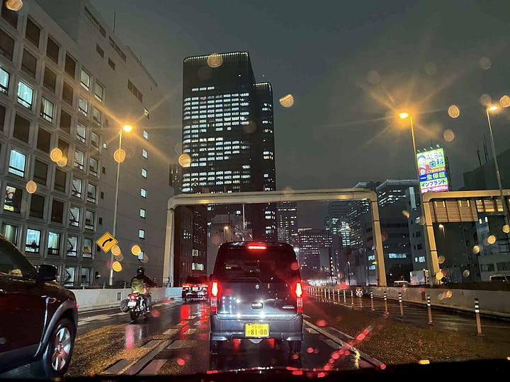 Utazásunk tehát egy közelgő tájfun idején kezdődött. Tokió ezúttal egészen más arcát mutatta, mint az elmúlt két évben bármikor: most nem a vonat ablakából bámultuk a huszonegyedik századi sci-fit, a felhőkarcolókat és a szemből elsuhanó szerelvényeket, hanem mi magunk próbáltunk a többi sokezer autóval átevickélni a nagyvárosi autópályák hatodik emelet magasságában kígyózó vonalán. Valahogy úgy éreztük magunkat, mint Bruce Willis az Ötödik elem városi száguldás-jeleneteiben: alattunk lenn a mélységben volt az utcaszint, eggyel felette egy másik autópálya vagy városi gyorsvasút, fölöttünk pedig a felhőkarcolók tornyosultak. Bruce Willis-szel ellentétben mi óránként öttel száguldoztunk.