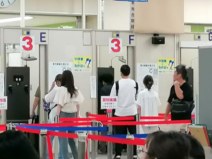 A névsorolvasás sajátságos volt: egy alacsony termetű hivatalnok hölgy időről időre kijött az ablak mögül, és félhangosan – szinte suttogva – mondta a neveket: „Szümiszü san, Nimal san, Mohammad san, Rahman san, onagayshimasu”… A terem zajos volt, légkondicionálók és ventilátorok működtek egyszerre, így gyakran többen is megindultak, hátha épp őket szólították. Amikor végre rám került a sor, egy kisebb csomag űrlapot kaptam; japán nyelvű papírokat, természetesen angol útmutató nélkül. A hivatalban dolgozók tényleg készségesek voltak, de a rendszer alapvetően abból indul ki, hogy a kérelmező ennyire már tud japánul. A kitöltés után illetéket kellett fizetni, majd következett a szemvizsgálat.