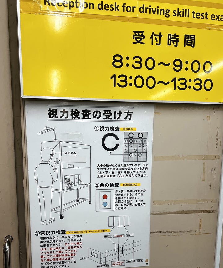 A szemvizsgálatról először azt képzeltem, hogy a japán kandzsikat kell majd felismernem és hangosan felolvasnom, de ennél sokkal egyszerűbb volt. A tipikus irányfelismerős tesztet kaptam, ahol a körön lévő lyukak irányát kellett megmondani. A közlekedési lámpák színét is megmutatták. Ennél a résznél már japánul mondtam, hogy „akai” és „aoi” (ez utóbbi egyébként a kék színt jelenti) A kék és zöld szín jelentőségéről a következő bekezdésében olvashattok.
