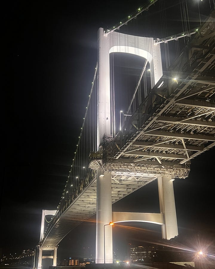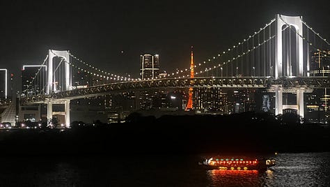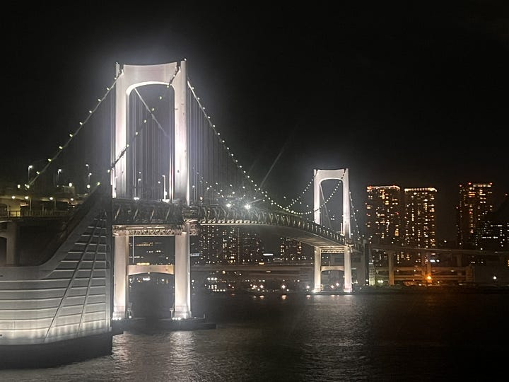 Alkonyat után Odaibából gyalog a Rainbow Bridge-en.