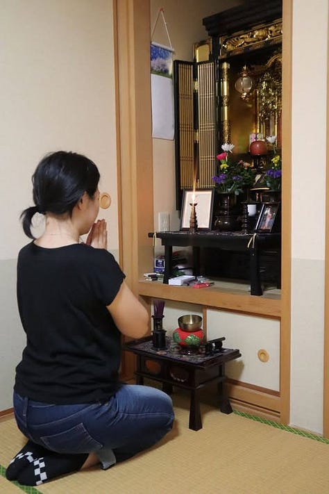 Csakhogy, ha jobban megnézzük, a templomok és szentélyek Japánban szinte minden sarkon ott állnak. Ha meglátogatsz egy japán családot, jó eséllyel találsz egy kis házi oltárt (butsudan), rajta füstölőt, egy csészét friss vízzel, és egy rizsgombócot, amely az elhunyt nagyszülőnek készült. A vallásosság Japánban nem annyira intézményes, egészen másképp működik. Nem tanítják és nem hirdetik, egyszerűen élnek vele, áthatja mindennapjaikat.